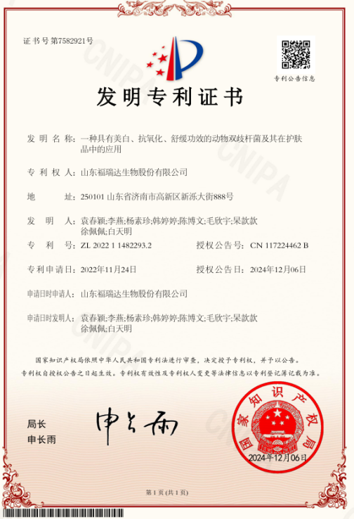 益修研:依托于福瑞达益生菌协同创新中心平台,瑷尔博士与山东大学联合发现了一株人体来源的益生菌——动物双歧杆菌W3(二裂酵母),并基于该菌株成功研发出兼具修护、美白、抗衰、抗氧化等多重功效的发酵滤液。并获得两项发明专利《一株动物双歧杆菌及应用》、《一种具有美白、抗氧化、舒缓功效的动物双歧杆菌及其在护肤品中的应用》。