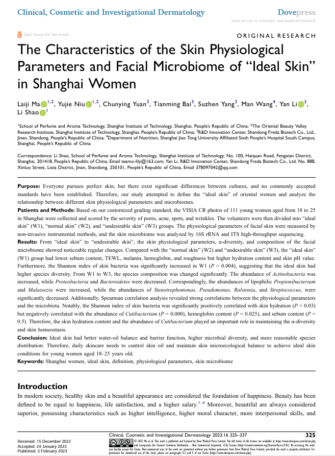 2022年,基于多年对东方女性皮肤生理参数和面部微生物菌群的深入研究,瑗尔博士科研团队,首次为“理想皮肤”赋予了具体、可量化的定义,并在国际期刊上发表了《The Characteristics of the Skin Physiological Parameters and Facial Microbiome of “ldeal Skin" in Shanghai Women》。