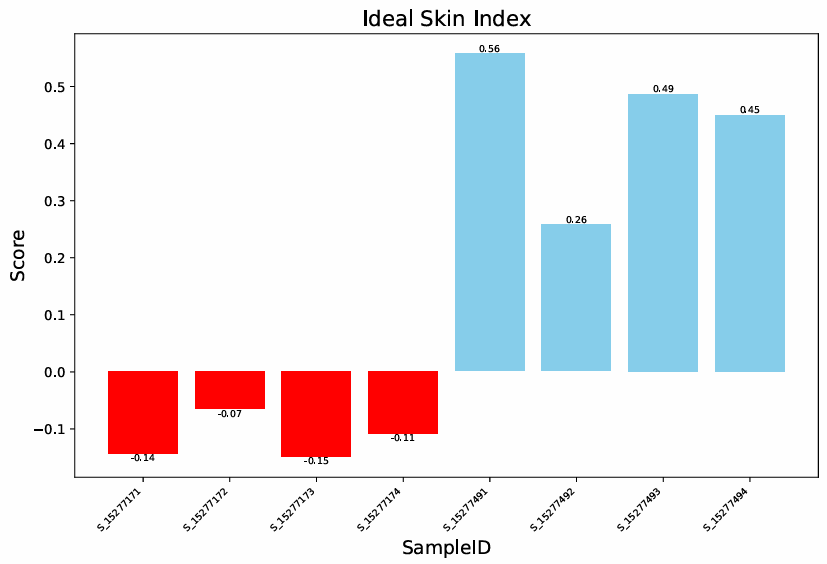 通过预训练的深度学习ResNet-18(深度残差网络)模型进行迁移学习,获取基于图像的特征,进一步提升了模型对皮肤状态的识别能力。基于这一优势,结合XGBoost算法构建的机器学习模型下,基于多模态数据融合,模型性能显著提升,并基于模型检测结果,提出“理想皮肤指数”。该指数可量化皮肤状态并识别潜在风险人群(通过输入新采集数据,AI模型会给出打分,以此判断皮肤状况)。