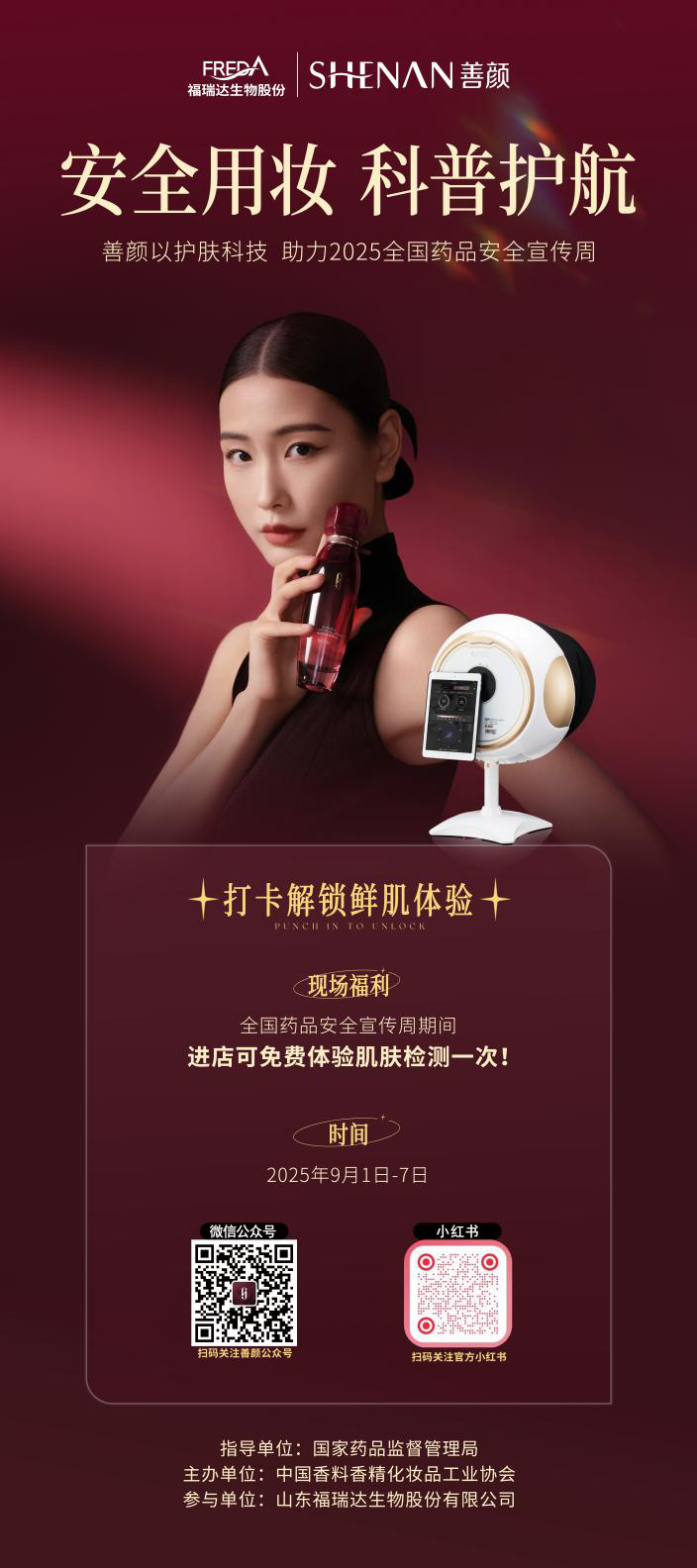 作为福瑞达生物股份旗下专注精准护肤的高端品牌,善颜将于9月1日至7日,在善颜•肌肤管理中心门店及公共区域开展“安全用妆、科普护航”的公益行动。该活动已被纳入中国香料香精化妆品工业协会“2025安全用妆科普宣传周”的系列重点项目。