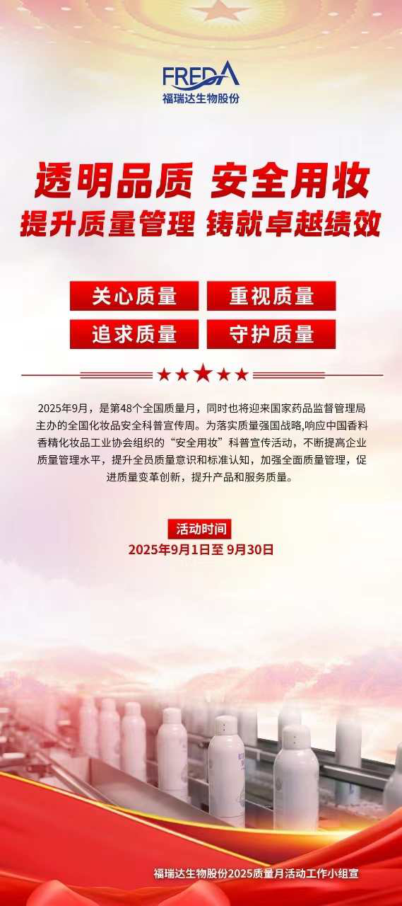 在公益科普之外,福瑞达同步于9月在企业内部开展“透明品质,安全用妆----2025年度质量月”活动,从宣传、培训、风险排查、溯源实践及技能竞赛五大维度系统推进质量建设。通过“质量月”活动,福瑞达将不断提高企业质量管理水平,提升全员质量意识和标准认知,加强全面质量管理,提升产品和服务质量,为消费者提供更优质、更安全的化妆品。